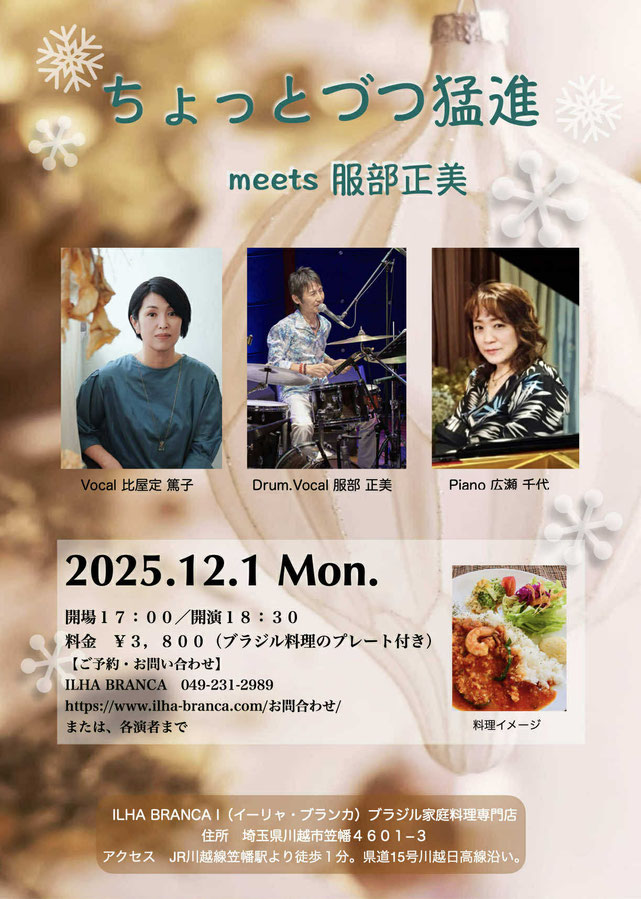 沖縄から比屋定篤子(Vo.) と広瀬千代(Pf.)を迎えてJ -POPのライブを行います。ドラムに服部正美が参戦し「ちょとづつ猛進」meets服部正美として楽しいひとときをお届けします。イーリャブランカのブラジルプレート付きの超お得なライブです。ぜひおいでください。